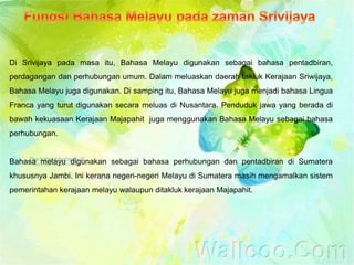 . Sebagai orang Melayu kita perlu memulakan sejarah bangsa dengan empayar Srivijaya dan bukan Melaka. 22 BAHASA MELAYU KUNO. Jajahannya yang luas di Alam Melayu menyebabkan bahasa Melayu menjadi lingua franca di rantau Asia Tenggara.